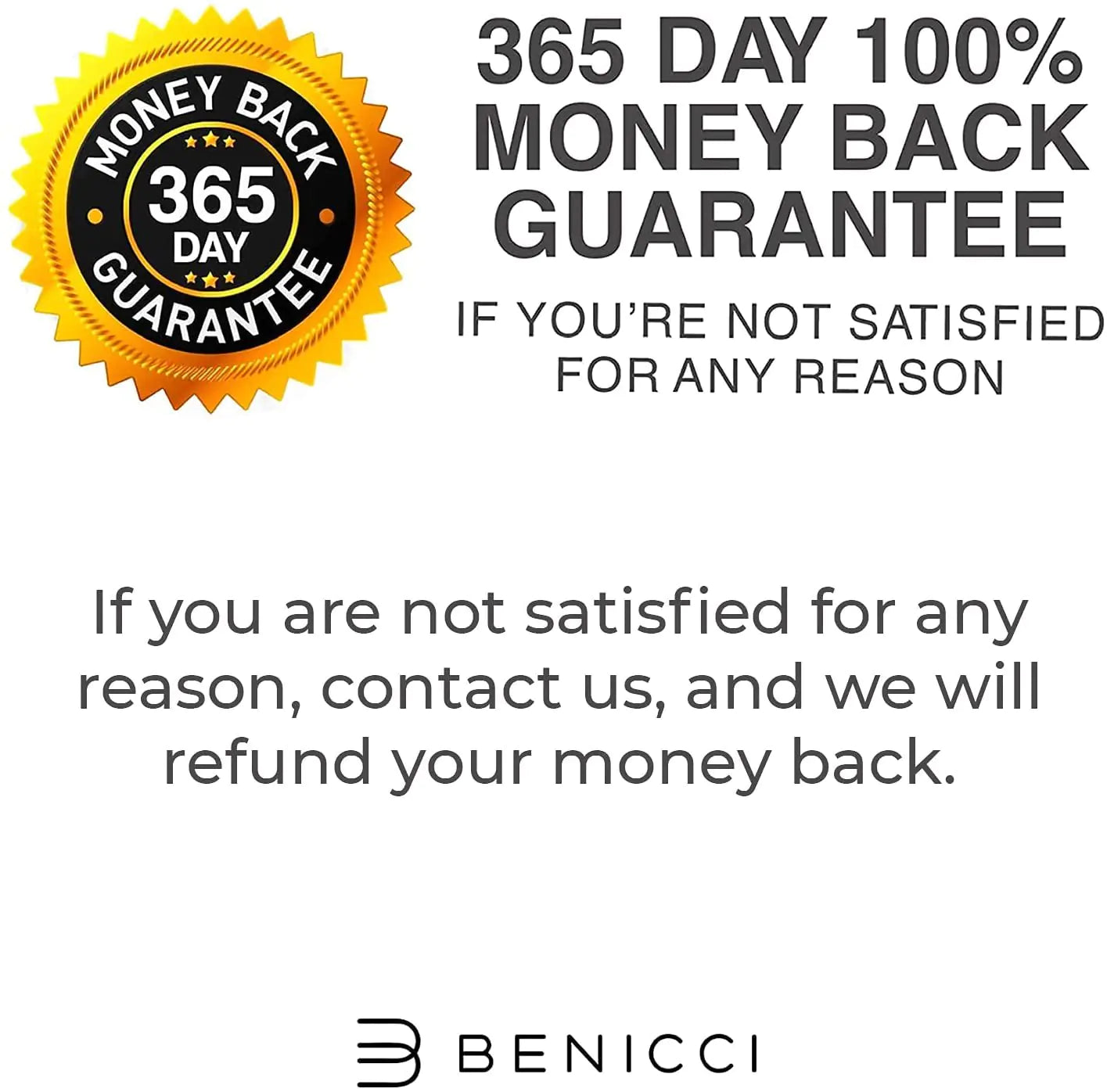 We have a 90-day 100% satisfaction guaranteed return policy. Return your unused item(s) in its original packaging. We will refund your full amount. Please contact care@benicci.comfor further instructions on how to process your return.